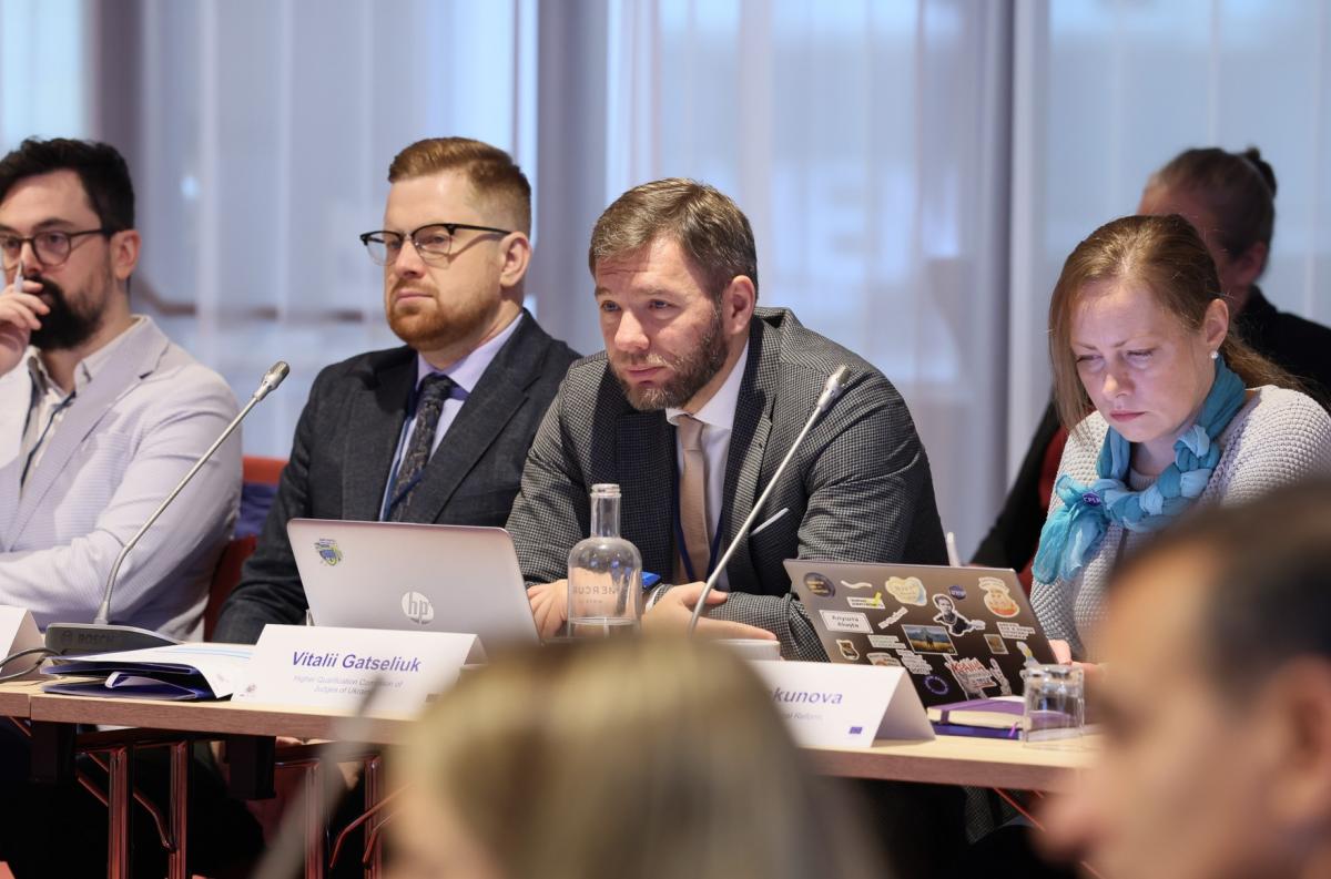 Vitalii Gatseliuk, a member of the High Qualification Commission of Judges of Ukraine, informed his foreign colleagues about the current procedures for the competitive selection of judges and their qualification assessment in the context of Ukraine’s European integration. He highlighted the specific features of the legal status and organisation of the work of the Commission’s auxiliary bodies – the Public Integrity Council, the Public Council of International Experts, and the Expert Council – in particular their access to the files of candidates for judicial positions.