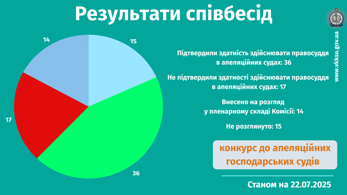 Загалом проведено співбесіди з 67 кандидатами: 36 кандидатів підтвердили здатність здійснювати правосуддя в апеляційному господарському суді, 17 кандидатів – не підтвердили, з 14 кандидатами співбесіди відбудуться у пленарному складі Комісії.