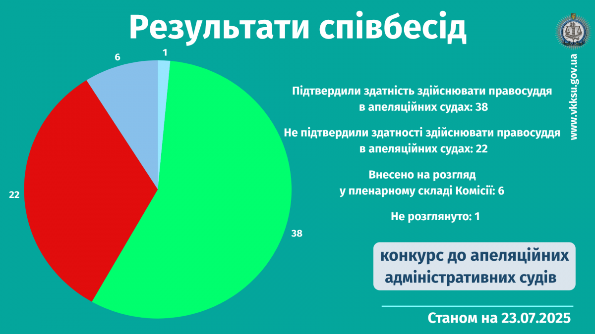 Загалом у конкурсі до апеляційних адміністративних судів проведено співбесіди з 66 кандидатами: 38 кандидатів підтвердили здатність здійснювати правосуддя в апеляційному адміністративному суді, 22 кандидати – не підтвердив, з 6 кандидатами співбесіди відбудуться у пленарному складі Комісії.