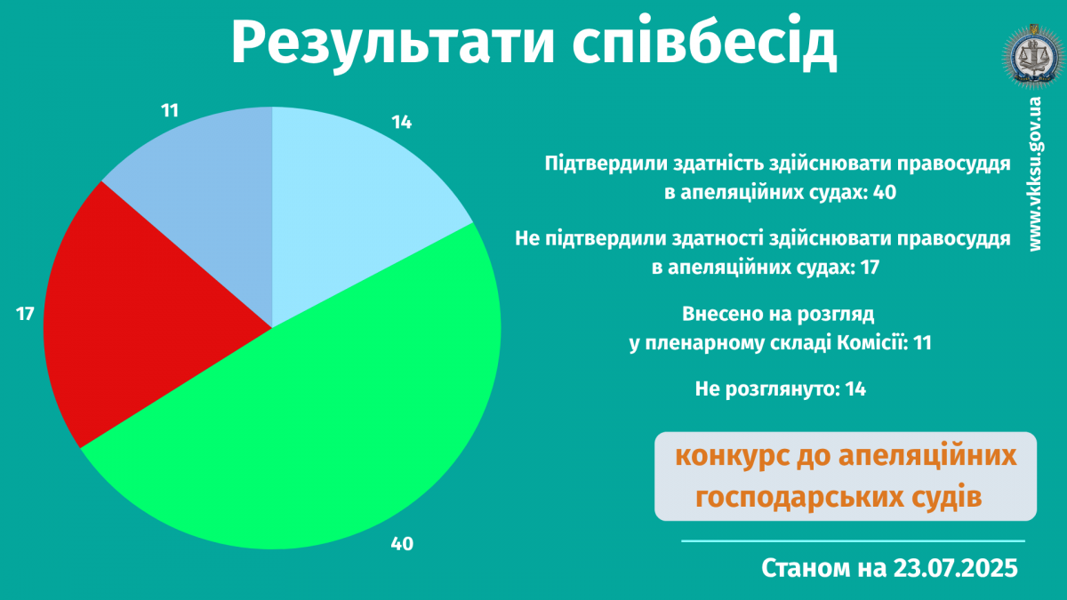 У конкурсі до апеляційних господарських судів проведено співбесіди з 68 кандидатами: 40 кандидатів підтвердили здатність здійснювати правосуддя в апеляційному господарському суді, 17 кандидатів – не підтвердили, з 11 кандидатами співбесіди відбудуться у пленарному складі Комісії.